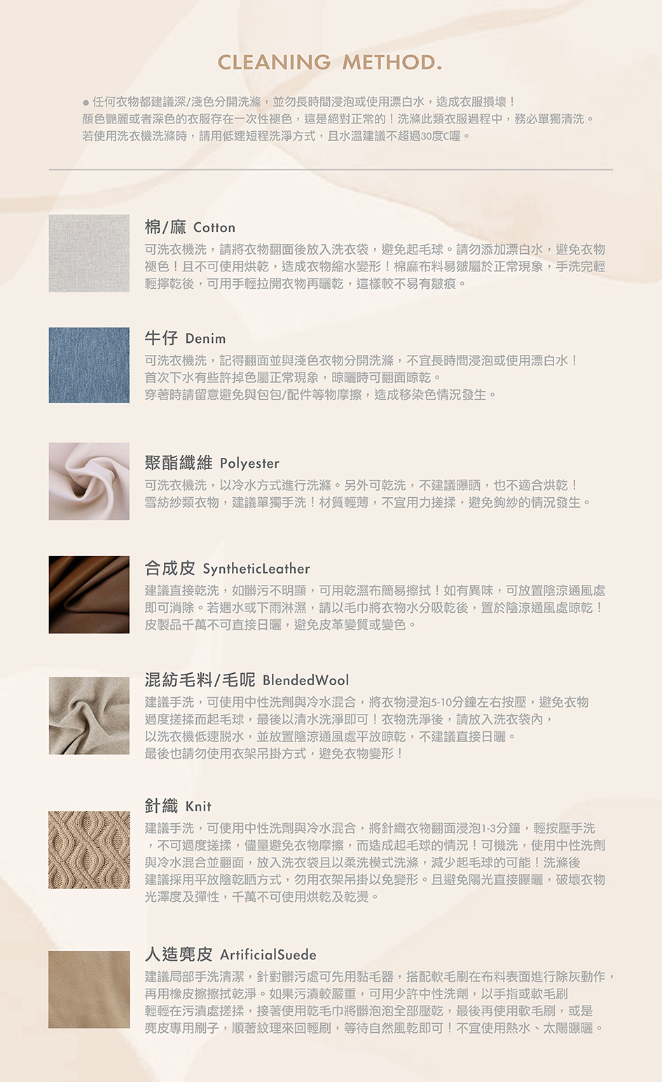 ● 任何衣服請勿長時間浸泡,勿使用漂白水及烘乾機,以免損壞